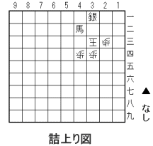 第72番 解答 5三金 3二玉 4二金 2一玉 3二金 同玉 3三角成 同玉 4二角成 まで9手詰 筋違いでない2枚の角と、玉と歩だけのすっきりした配置。 詰上りとともに、美形を見てもらいたいところです。 手順の方は、変化はほとんどありません。 金の3連用で玉を3二に動かし、3三角成捨ての決め手を出します。 初手からいきなり3三角成は、逃げられて詰みません。